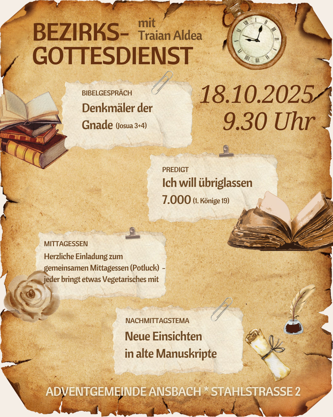 Am 18. Oktober fand der Bezirksgottesdienst mit Traian Aldea hier bei uns in Ansbach statt.Das Thema des Bibelgesprächs war "Denkmäler der Gnade" (Josua 3+4), das Predigtthema "Ich will übriglassen 7000" (1. Könige 19) und Mittags waren wieder alle zum vegetarischen Potluck eingeladen. Das Thema am Nachmittag drehte sich um neue Einsichten in Alte Manuskripte.