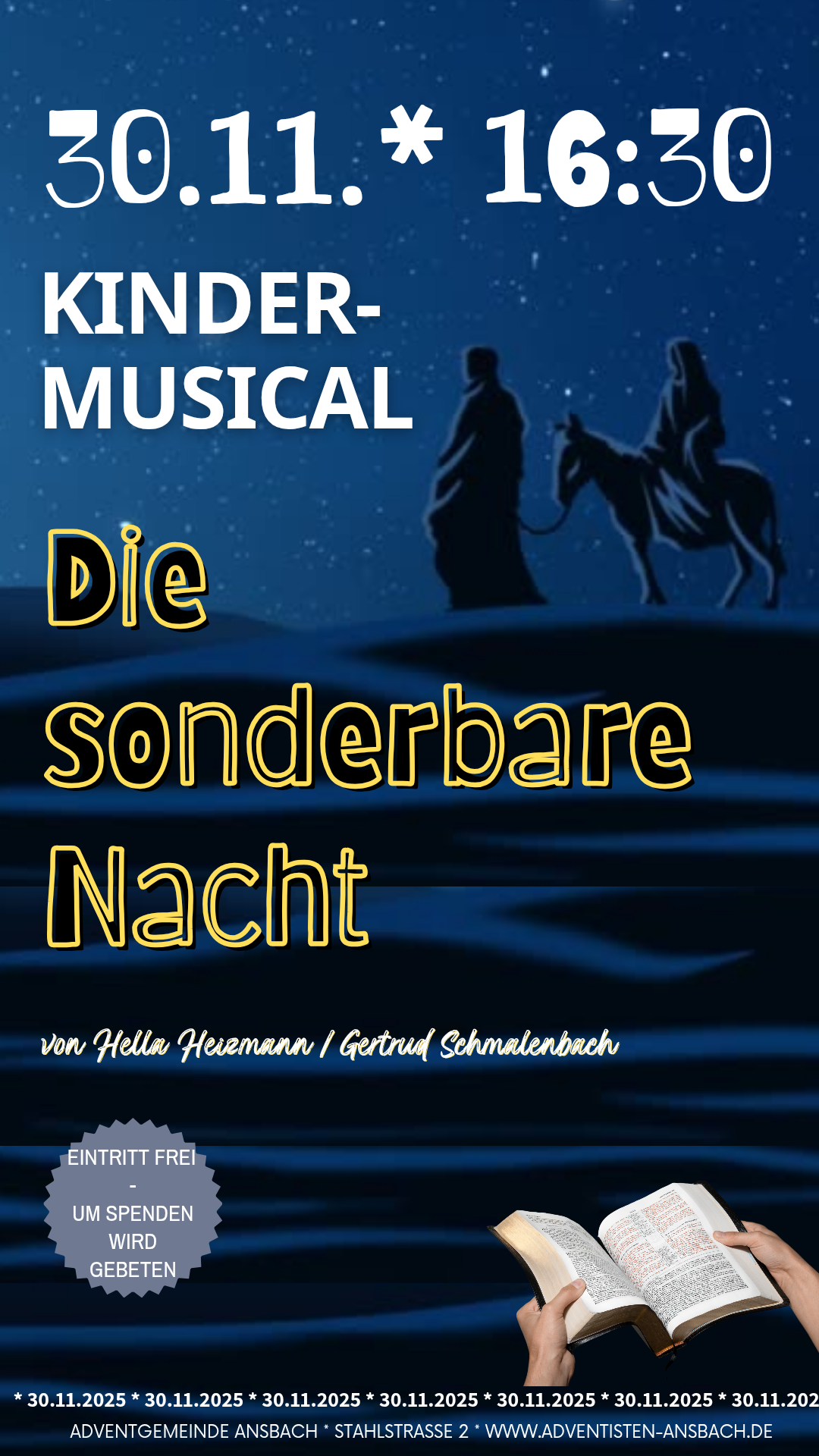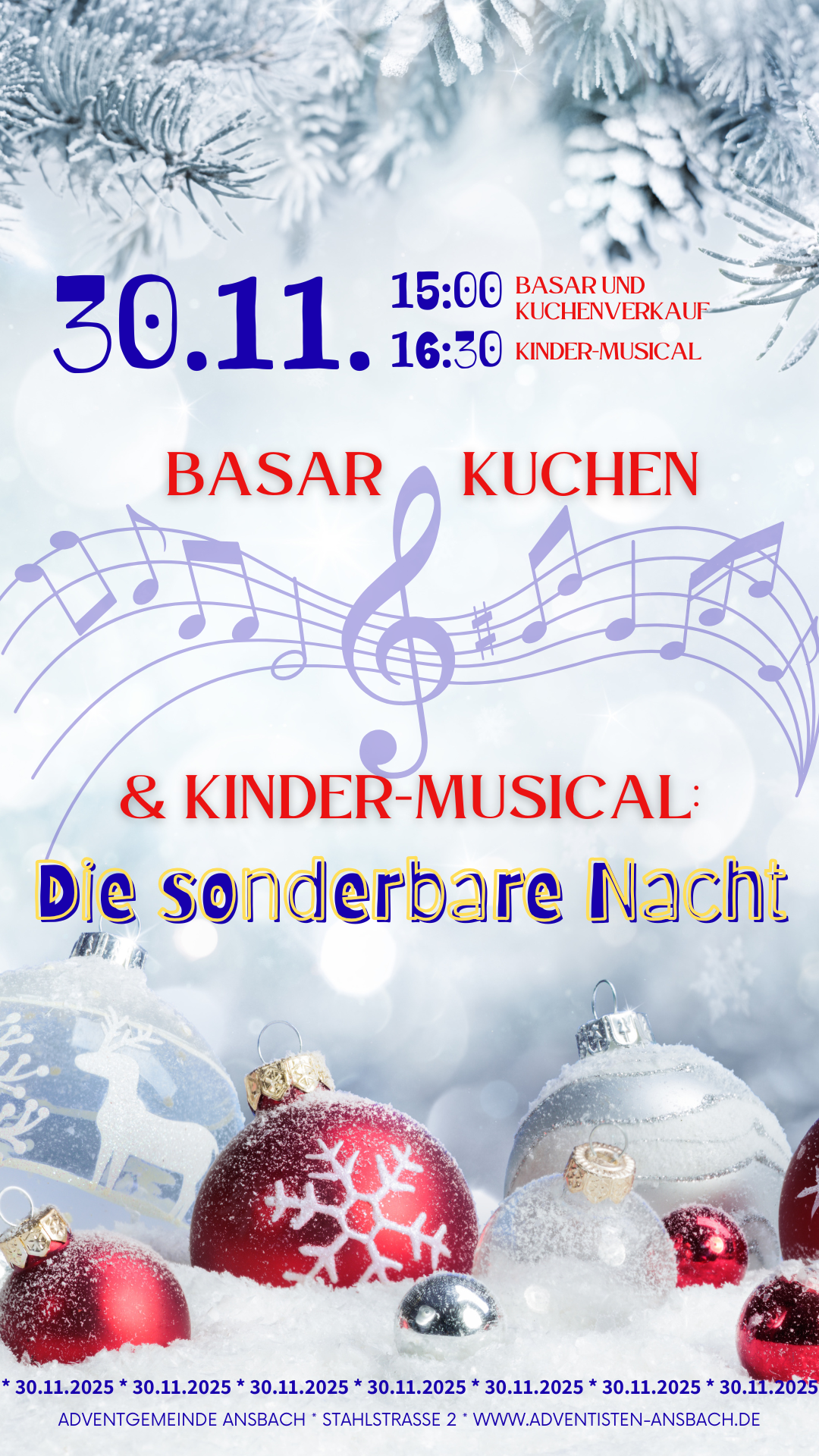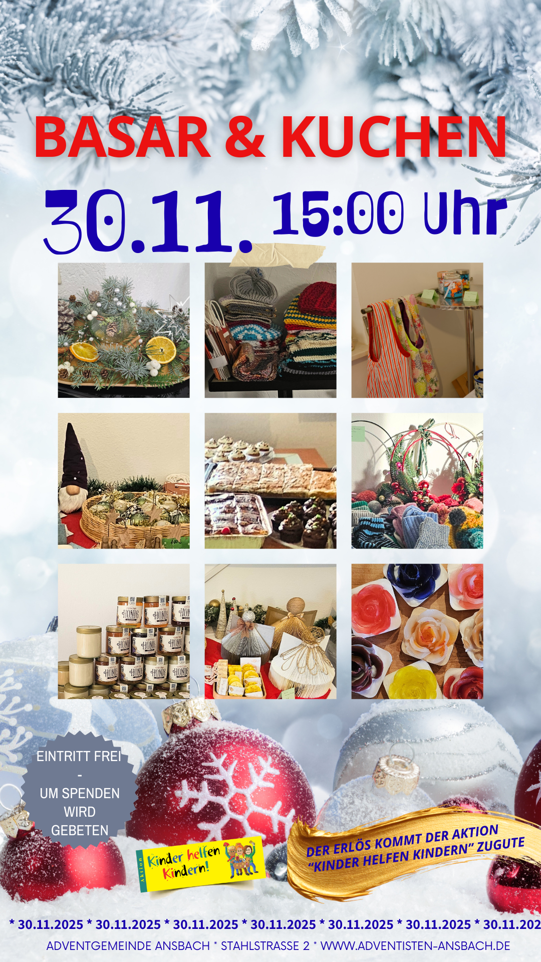 Herzliche Einladung zum Basar und Kuchen am 30.11.2025 um 15.00 Uhr. Der Erlös kommt der Aktion Kinder helfen Kindern von ADRA zugute. Um 16.30 wird dann das Kinder-Musical Die sonderbare Nacht aufgeführt wozu auch jeder herzlich willkommen ist. Der Eintritt ist frei - auch hier erbitten wir Spenden für die Aktion Kinder helfen Kindern. Vielen Dank!